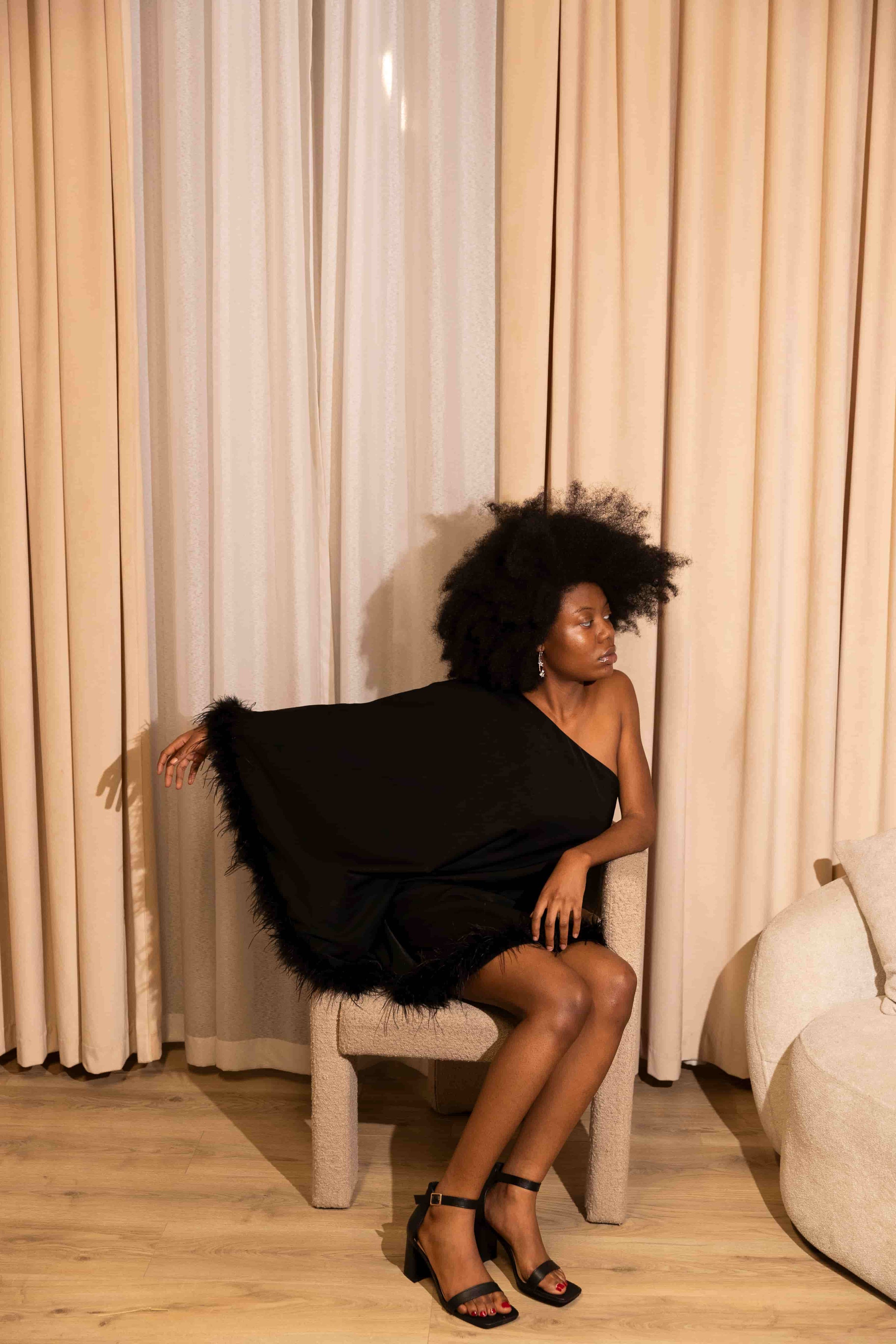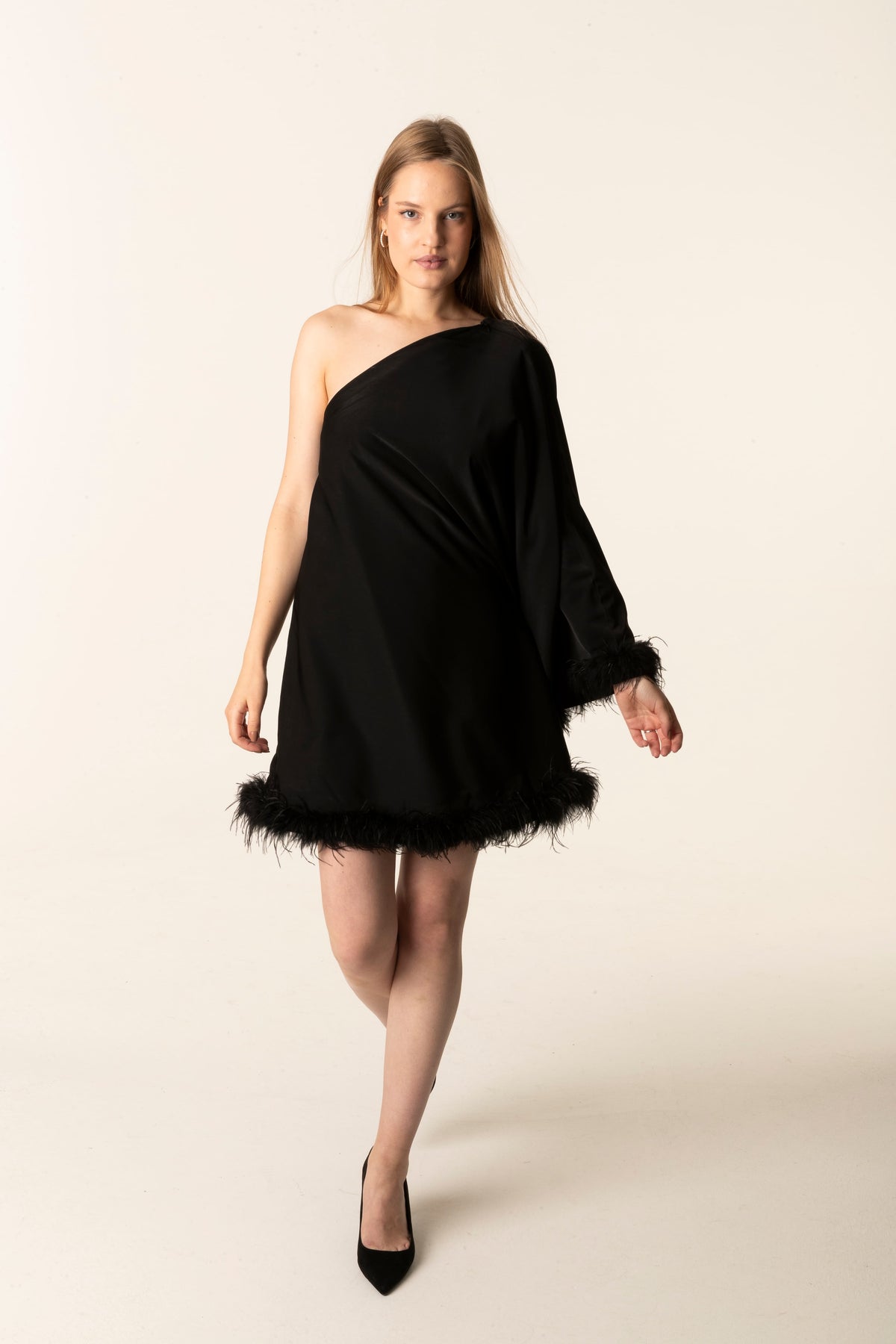 The Black Fur-Trim One-Shoulder Dress combines modern style with classic appeal. Its mid-thigh length and one-shoulder design add a touch of sophistication, while the open shoulder detail allows you to wear it on either shoulder, giving you the flexibility to customize your look.The luxurious black fur trim, adorning the lower circumference and extending to the sleeve area, adds a rich texture and a cozy touch. Perfect for evening events or upscale gatherings, this dress provides both comfort and high-fashion. Crafted from great-quality material, it’s a standout piece that exudes elegance and individuality.