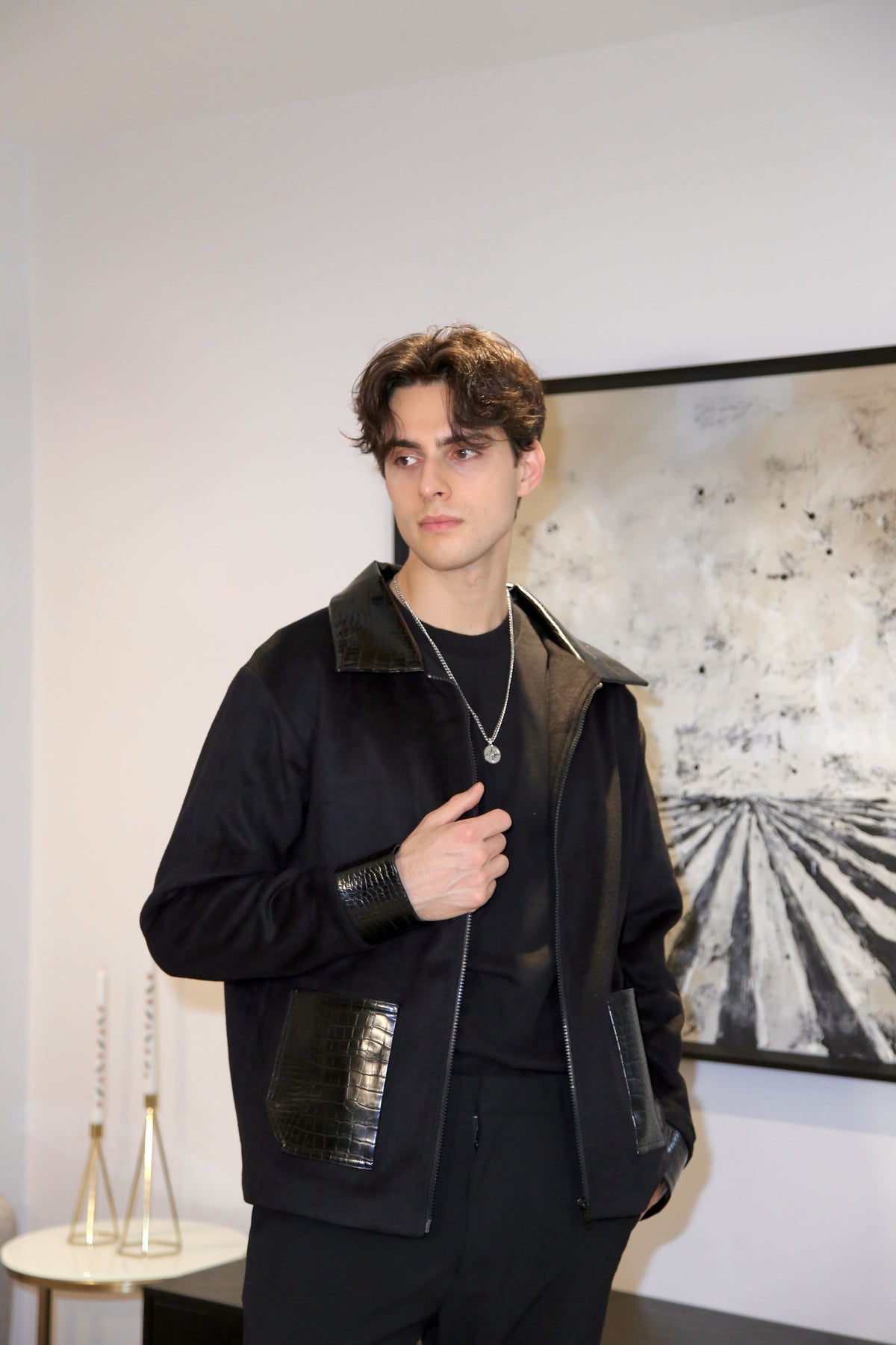 • Black structured jacket with leather-look pocket detail